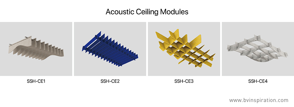 ● Ceiling panels: Designed to be installed in the ceiling, they offer a significant reduction of reverberation and improve the clarity of sound in the space.